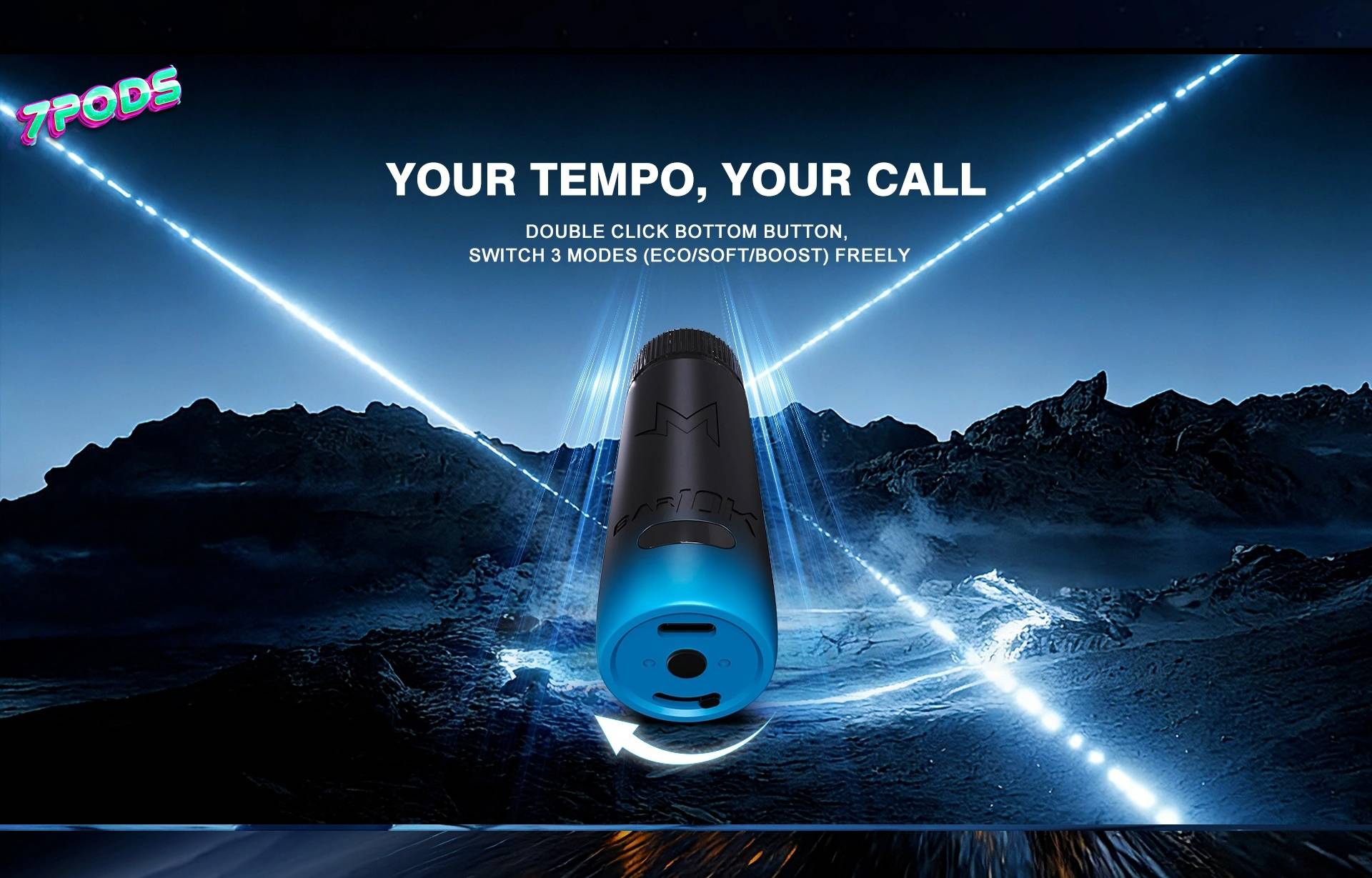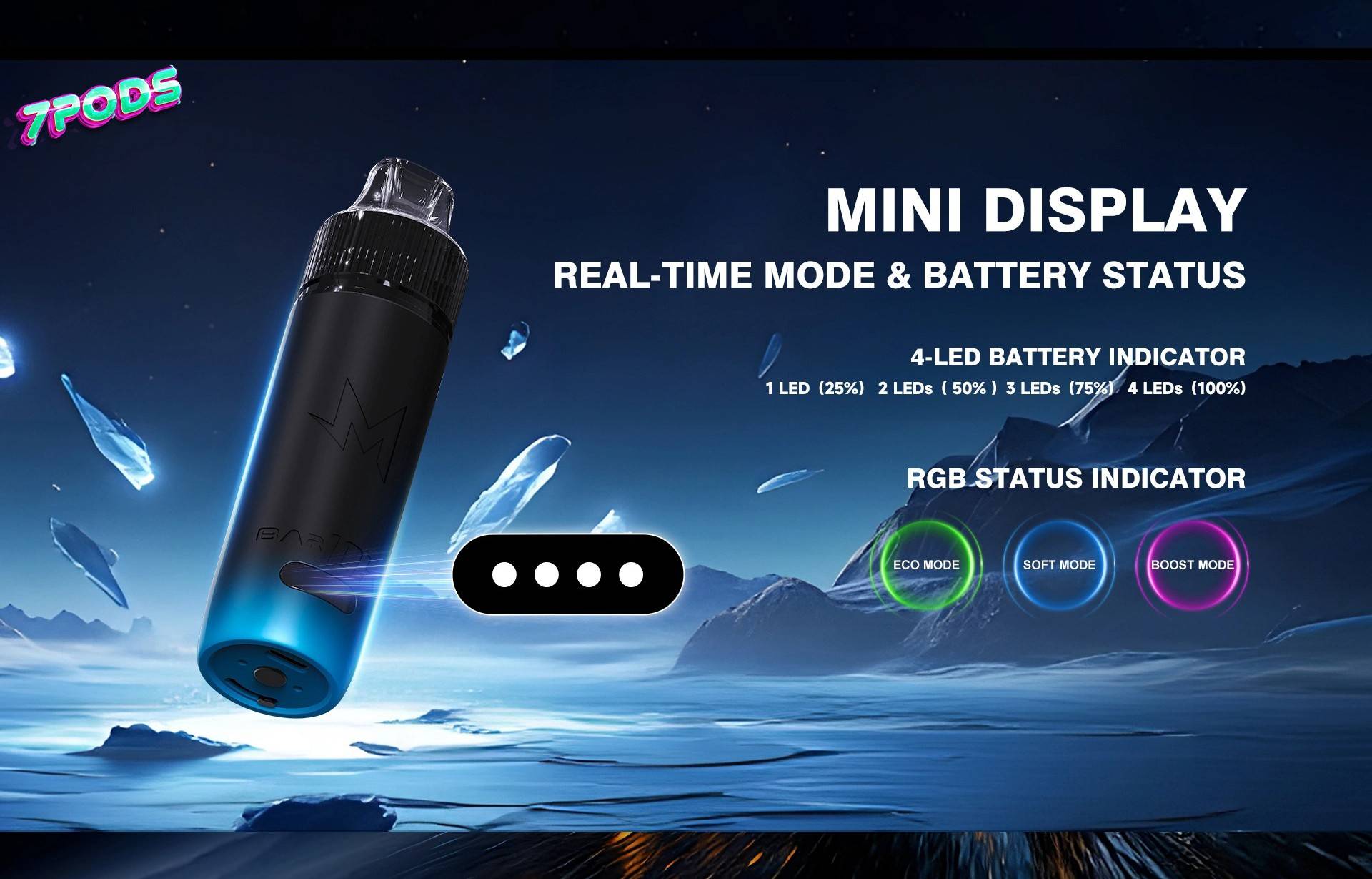ไม่ต้องเดาอีกต่อไปว่าแบตเตอรี่จะหมดเมื่อไหร่ เพราะ M BAR 10K มาพร้อมหน้าจอแสดงผลและไฟ LED 4 จุด ที่บอกระดับแบตเตอรี่อย่างแม่นยำ (1 ดวง = 25%, 2 ดวง = 50%, 3 ดวง = 75%, 4 ดวง = 100%) พร้อมไฟ RGB ที่เปลี่ยนสีตามโหมดการใช้งาน (ECO = สีเขียว, SOFT = สีน้ำเงิน, BOOST = สีม่วง) เพิ่มความพรีเมียมในทุกครั้งที่หยิบขึ้นมาสูบ